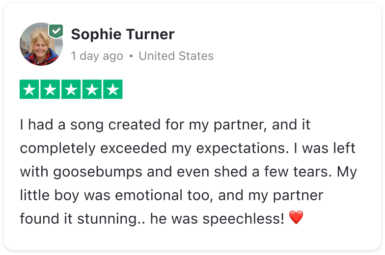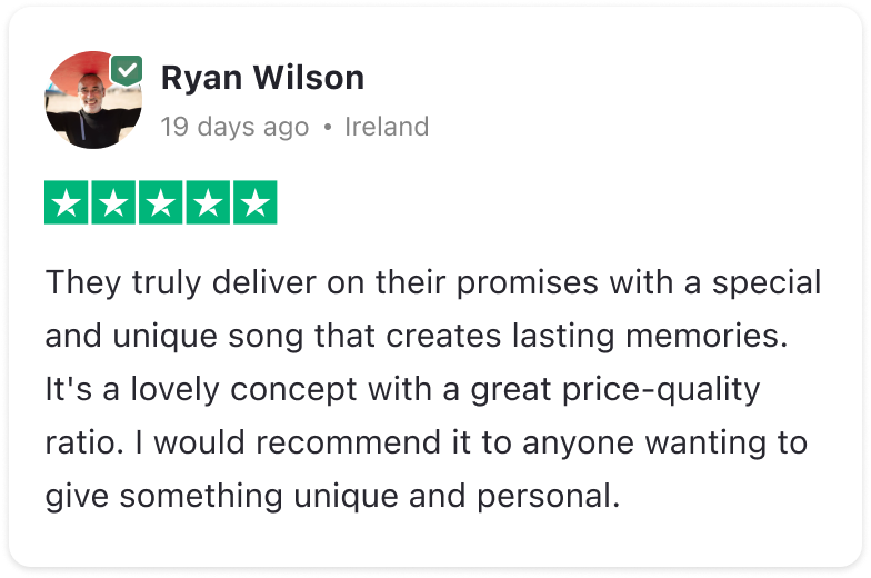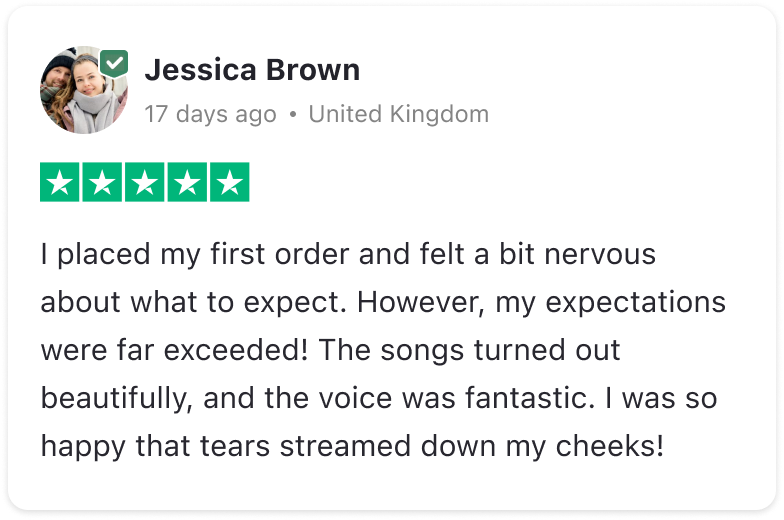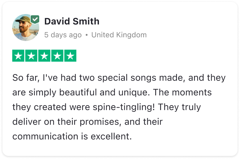 Within 3 days, you’ll receive your personalized song as a digital audio file via email. Ready to listen, share, and cherish forever. (Next day delivery available)