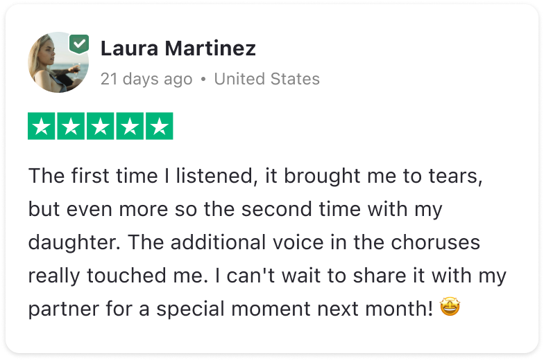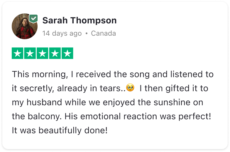 Our team turns your words into a one-of-a-kind, emotional, and professionally produced song. Every detail is crafted with care — from lyrics to melody to final mix.